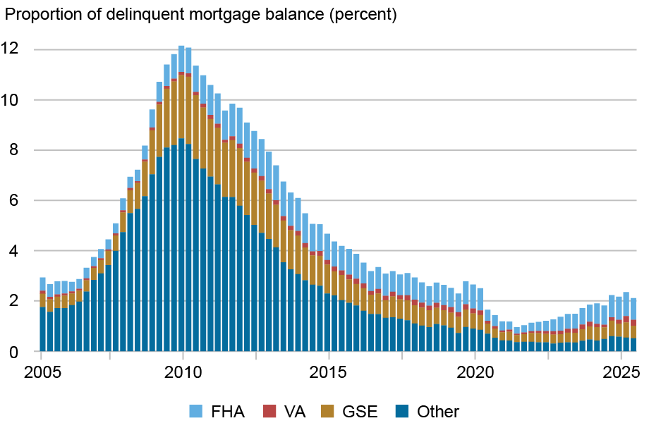 We next consider the actual dollar share of mortgages that are delinquent broken out by mortgage type. Currently, 2.1 percent of mortgage balances are 30 or more days past due, which is slightly below pre-pandemic levels in 2019:Q1. In 2025:Q2, GSE loans make up more than half of all mortgage debt, but less than a quarter of delinquent mortgages. On the other hand, FHA loans make up 38 percent of 30+ day delinquent balances despite constituting only 12 percent of total balances. This is a larger proportion of delinquent balances compared to before the pandemic, when FHA loans made up only 30.5 percent of delinquent balances in 2019:Q1. A look at the historic data shows that the markedly elevated levels observed in the teal bars prior to 2010 in the chart above align with the predominance of subprime and Alt-A mortgages in that category.