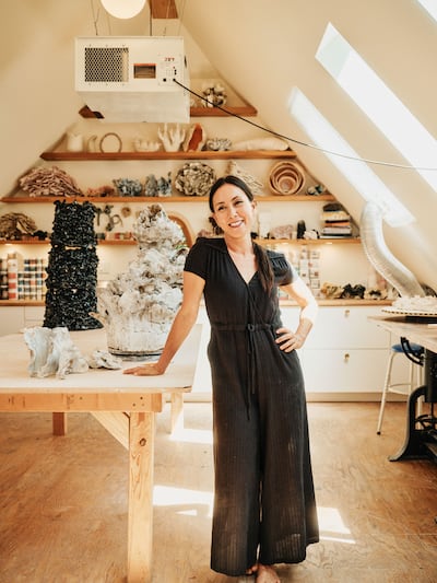 While Peter was set to be an artist from a young age (one of his earliest childhood declarations of what he wanted to be as a grown-up hangs on the wall in the office), Kimberly took a different route. She wanted to be an artist, but that desire was repressed and, instead, she became a nurse. After taking time to raise her kids, she slowly began to gravitate back to the creative urge, drawn to ceramic shapes that fall between feminine and oceanic. “I like to call it primal feminism,” she says in her studio, a perched space in the garage behind the house. “I was pounding out trauma from my body; it wasn’t always comfortable, but it was a necessity. It felt frantic.”