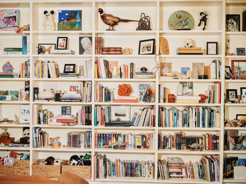 “We’re stuff people,” Kimberly Gronquist tells me as I examine her living room’s floor-to-ceiling shelves. The offerings are rabbit holes, spines upon spines of books—fantasy reads, encyclopedias, historical butted against pop fiction, Kiki Man Ray and Book of Earth face forward—alongside old Barbie dolls, a pink curved alligator, a maneki cat, wicker baskets of masks, and a toy banana, too.