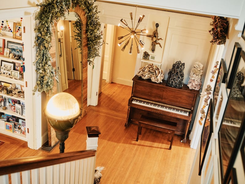 The shelves are just a small sliver of the 1908 home in Southwest Portland or, more accurately, the creative world inside the walls. These four floors—from the multicolored disco-lit basement with the half-pipe, to the wild unfurling ceramics on the walls, dried eucalyptus wreathed across the door frame, or the airy atrium overlooking the English-style garden—are eclectic and warm. But there’s also a hint of spontaneity, artistry teetering on randomness, in an alluring way. “It’s totally not thoughtful,” Gronquist says.