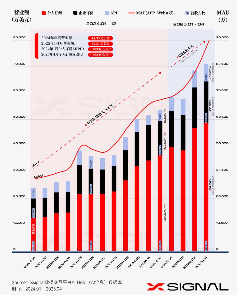 Looking back at the growth of ChatGPT’s user volume, data from the Xsignal AI Holo (AI Holographic) database shows that from its launch in November 2022 to December 2023, ChatGPT’s MAU exceeded 200 million. In 2024, the MAU continued to surge from 320 million to 650 million, with an annual growth rate of up to 103.88%. In the first quarter of this year, ChatGPT achieved a significant growth of 35.61%, and the MAU was close to 900 million.