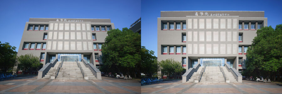 A normal lens (left) vs. a tilt-shift lens used to photograph a building. Image credit: TTArtisanPrice and positioning
