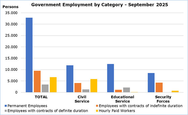 In September 2025, total government employment reached 52.530 persons, recording a slight decrease of 50 employees (-0,1%) compared to September 2024. Employment in the Civil Service and in the Security Forces declined by 1,0% and 2,4% respectively, while employment in the Educational Service increased by 3,3%.
