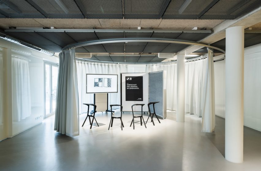 “Changing settings within a very short time requires furniture able to meet these demands,” Matthias Gumhalter, one of the principal Architects of Studio WG3, told Dezeen. “Plank’s Miura stools and tables, designed by Konstantin Grcic, offer highly functional support and withstand intensive use.”
