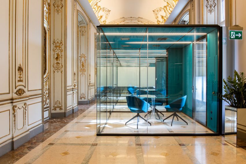 Enclosed contemporary meeting areas contrast with the interiors’ elaborate decoration. Inside the glass boxes are Icon chairs – designed by Marcello Ziliani for Mara – upholstered in a dark blue fabric to match the room’s ceilings and back walls.