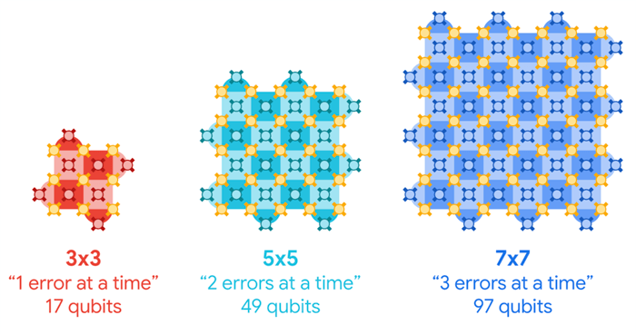 I know this is a technical subject, so the key point to understand is that Google’s error correction methodology demonstrated that by building larger quantum computing lattices – as shown above – it was able to correct more quantum errors.