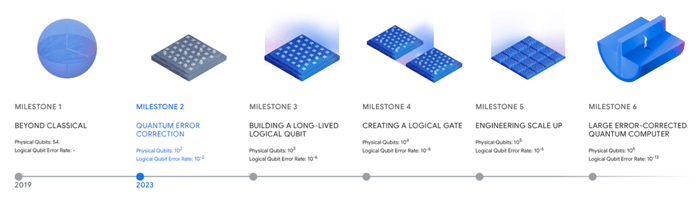 According to Google, which consistently undersells how much progress they are making with their quantum computers, it is only at “Milestone 2” shown below.