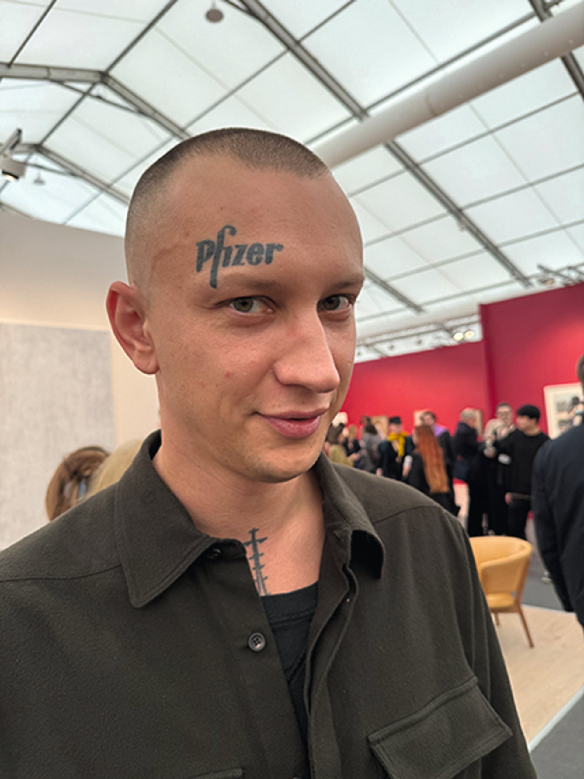 The Russian performance artist Petr Davydtchenko was stopped by curious visitors at Frieze London keen to look at his distinctive tattoos, such as the word Pfizer inked across his forehead. The green-ish lettering daubed on his cranium is a protest against the actions of big pharmaceutical companies during the coronavirus pandemic. All of Davydtchenko’s tattoos—from head to foot—have been measured and photographed for an archive piece called Skin in the Game (2025), which was acquired earlier this year by A/POLITICAL, a London-based collection dedicated to radical, politically engaged art. We asked Petr if getting the tattoos hurt, but he (bravely) insists that he does not suffer for his body art. Davydtchenko is also known for surviving long periods on a diet of roadkill animals such as foxes and cats. Yummy…