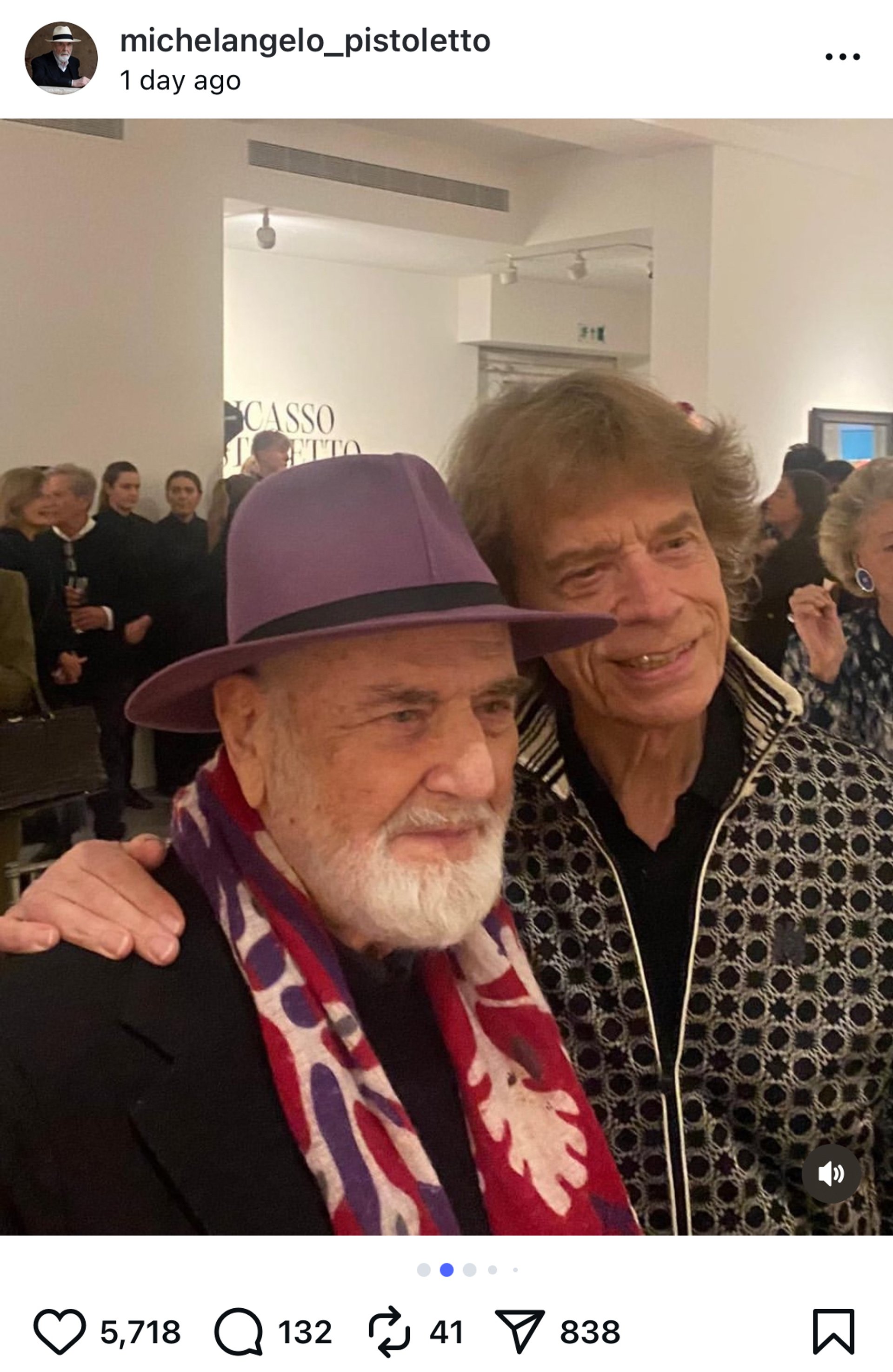 They nearly share a name and they both have iconic status. They are also both extremely sprightly considering their greatly advanced years. It was hard to tell who was the more excited when Mick (Jagger) met Michelangelo (Pistoletto) for the first time at the opening of Nahmad Projects’s exhibition, which intersperses 15 of Pistoletto’s new Mirror Paintings with classic Cubist paintings by Pablo Picasso. The duo went on to bond further at a dinner held in the gallery with the dapper king of Arte Povera also conducting an animated conversation with the famously art loving Leonardo DiCaprio. It was the conceptual artist, rather than the actor or the rock star, who chose to post the encounter on his Instagram.