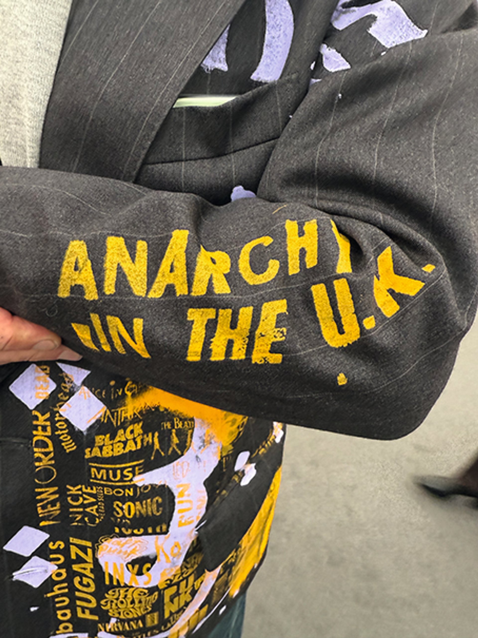 The Belgian collector Alain Servais stood out at the Frieze London VIP day in a blazer emblazoned with the names of some stellar British rock groups. “I bought this jacket in Milan, it’s one of a set of three by an Iranian artist,” he told us, pointing to the Sex Pistols, The Who and Black Sabbath daubed in large yellow letters on his clothing. This blazer is especially for London, added Servais, highlighting proudly the archetypal rebel mantra—“Anarchy in the UK”—splashed across the sleeve. Servais, a fixture on the art fair circuit, is never seen without a jaunty cravat and always weighs in with his robust opinions on the world (and the art market).