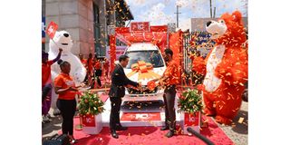 Halotel Tanzania’s Managing Director, Mr Bui Van Thang (left), cuts the ribbon to launch a special customer promotion offering the chance to win a Subaru car, while Director of the Business Department at Halotel Tanzania, Mr Abdallah Salum, stands on the right.