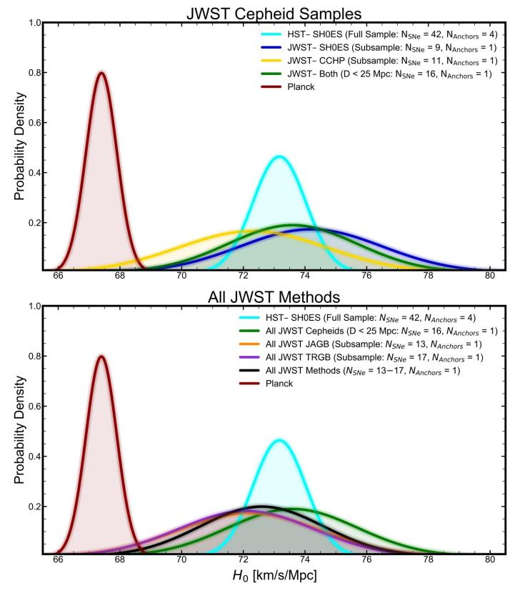 This graph shows a comparison between the value of H0, or the expansion rate today, as derived from Hubble space telescope Cepheids and anchors as well as other subsamples of JWST Cepheids (or other types of stars) and anchors. A comparison to Planck, which uses the early relic method instead of the distance ladder method, is also shown. Very clearly, the distance ladder and early relic methods do not yield mutually compatible results.
