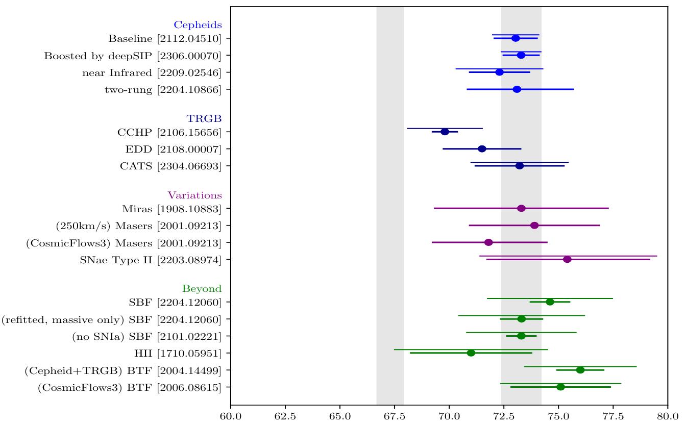 A 2023-era analysis of the various measurements for the expansion rate using distance ladder methods, dependent on which sample, which analysis, and which set of indicators are used. Note that the CCHP group, the only one to obtain a “low” value of the expansion rate, is only reporting statistical uncertainties, and does not quantify their systematic uncertainties at present. There is overwhelming consensus agreement that the expansion rate is around 73 km/s/Mpc using a wide variety of distance ladder methods.