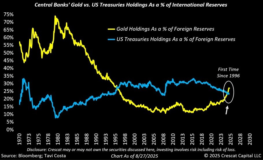 Indeed, foreign central banks now hold more gold than U.S. Treasuries for the first time since 1996 – a symbolic shift in global trust.