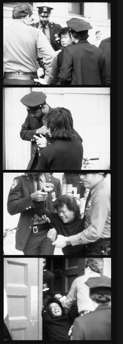 Of course, it is neither. Hsieh was forever chasing the idea that art time and life time should be coextensive, and he was an undocumented immigrant: the experiences he cultivated were not abstract premises but real risks. In 1978, he did a piece (not in the Dia show) called Wanted by U.S. Immigration Service, a poster complete with photo, biometrics, and fingerprints. It was spurred, he said, by the depression brought on by living underground, in constant fear of detention, unable to make art. In 1982, while he was surviving on the streets for Outdoor Piece, he took part in a show, contributing the following statement: “I shall publish my WANTED poster in the exhibition ILLEGAL AMERICA at Franklin Furnace in New York. If someone should see me, please call the Immigration Service at 212-349-8735.” He was in fact arrested (but not deported) on March 3, 1982, during the course of Outdoor Piece and while Illegal America was on view, not because someone who saw his declaration at Franklin Furnace decided to take him up on the challenge—rather, he was charged with assault with a blunt object for defending himself in an altercation. You can see the arrest record in the documentation of Outdoor Piece at Dia—art and life merging, in the best and worst possible ways.