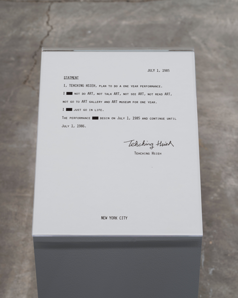 No Art and Tehching Hsieh 1986–1999 (Thirteen Year Plan)—the latter involved making work for the period in question that would never be seen by anyone—are documented differently: the curators have placed the statements of intention and calendars with no dates circled in otherwise empty galleries.