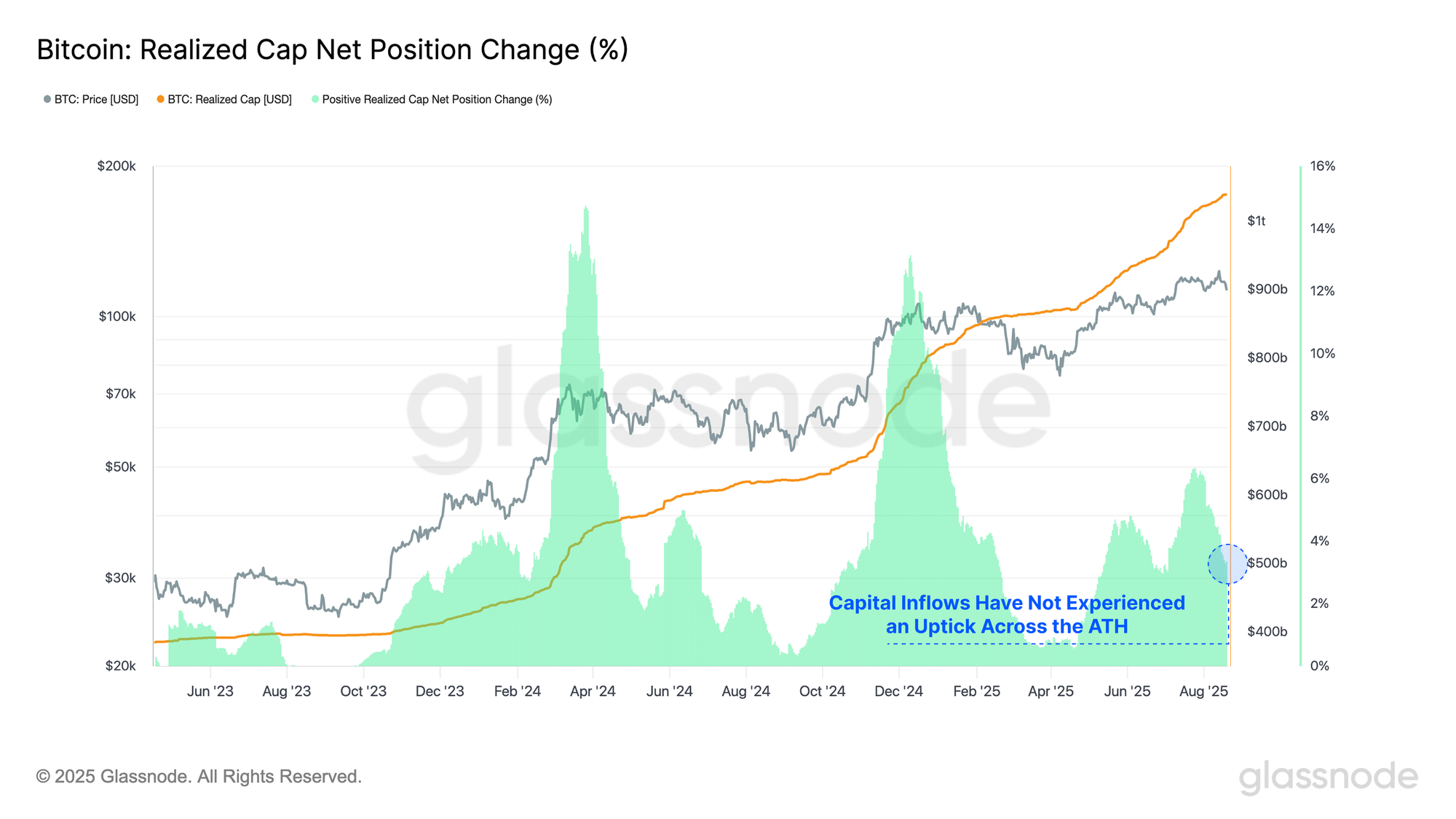 Following the formation of a $124.4K high last week, Bitcoin’s upward momentum has stalled, with price retracing to a low of $112.9K, a near -9.2% pullback. This decline has been accompanied by noticeably weaker capital inflows over recent weeks, suggesting that investors were unwilling to inject fresh capital at those elevated price levels.