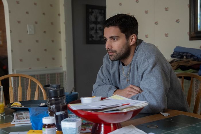 In the first half of Brag Ingelsby’s series follow-up to Mare of Easttown, Grasso is a slick operator who shifts between tough-guy posturing and a besotted romance with new colleague Lizzie (Alison Oliver). But Grasso has been leaking information about his task-force team’s investigation into Dark Hearts leader Jayson (Sam Keeley), and when his treachery inadvertently gets Lizzie killed, Frankel replaces Grasso’s rakish grin and self-assured lean with forlorn eyes and drooped shoulders. In the finale, Grasso gets a chance to redeem himself, betraying the Dark Hearts and racing into the woods to rescue Maeve, a young woman being targeted by the biker gang, all while bleeding from a bullet wound of his own. By killing Jayson, Grasso saves Maeve and gives them both a second chance.