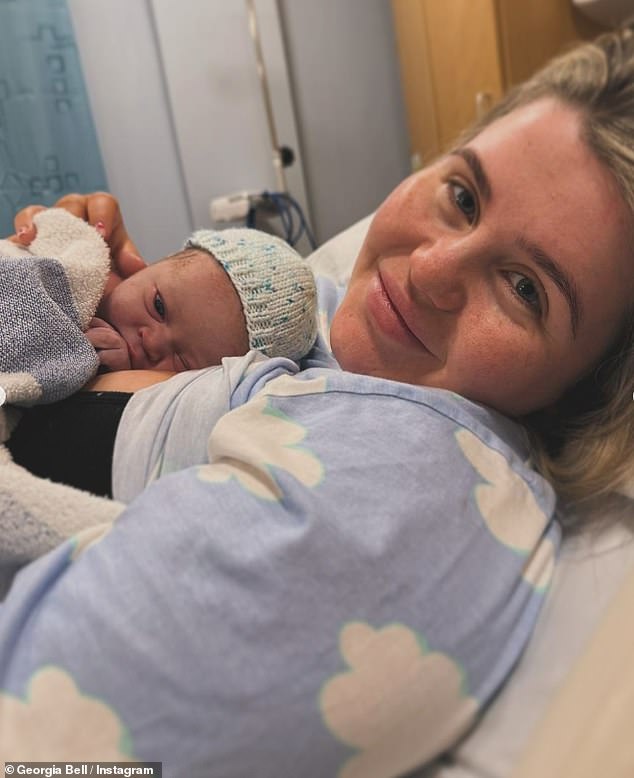 Georgia posted a photo of her little boy in a white baby grow with bunnies and penned: ‘Ralphie James Newby. Our precious boy born Nov 10th 11:27pm weighing 7lbs10oz.