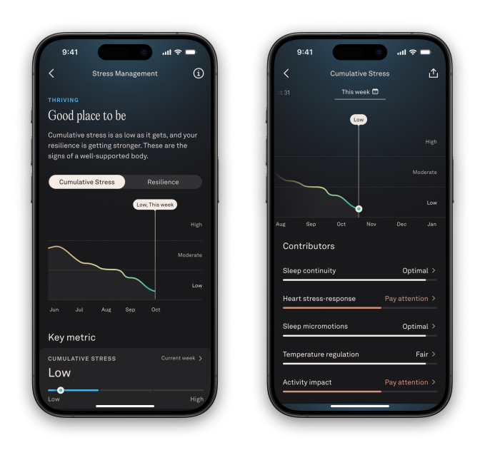 “It’s much more than just tallying the hours spent in stressful periods,” Oura VP of Consumer Software Product, Jason Russell, told TechCrunch. “It’s actually measuring different bodily functions indicative of cumulative stress taking a toll on your body. So things like how your heart rate and heart rate variability respond after a period of stress is indicative of cumulative stress. Your thermodynamics. How you regulate temperature overnight, how continuous your sleep is. Whether you experience what we call sleep, micro-motions, so not just big movements during sleep, but twitches. There are little signatures that would be indicative of your body experiencing high cumulative stress.”