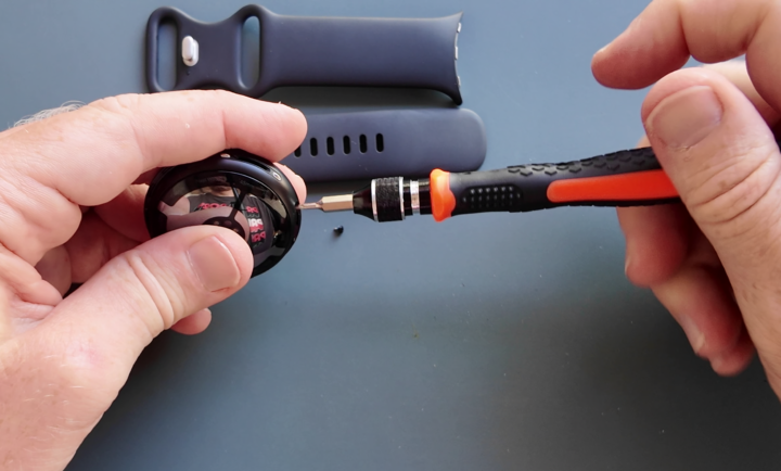 In any case, to get started, you’ll remove the bands, and then the two outer screws (one on each side):