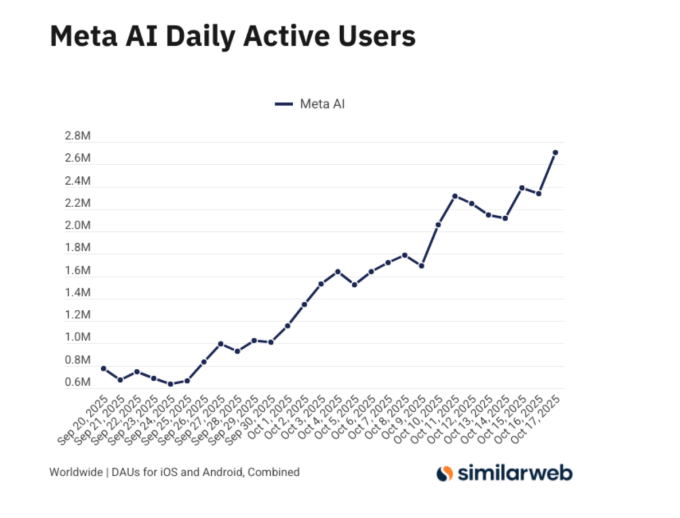 New data indicates that use of Meta AI’s mobile app for iOS and Android has seen a significant increase. According to a new analysis from market intelligence provider Similarweb, the app’s daily active users across both platforms jumped to 2.7 million as of October 17, up from around 775,000 just four weeks ago. In addition, Meta AI’s app installs are also up, reaching 300,000 new downloads per day, compared with under 200,000 daily downloads a few weeks ago.