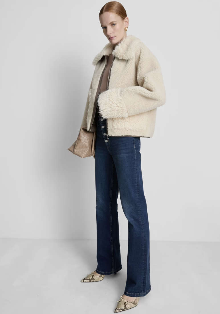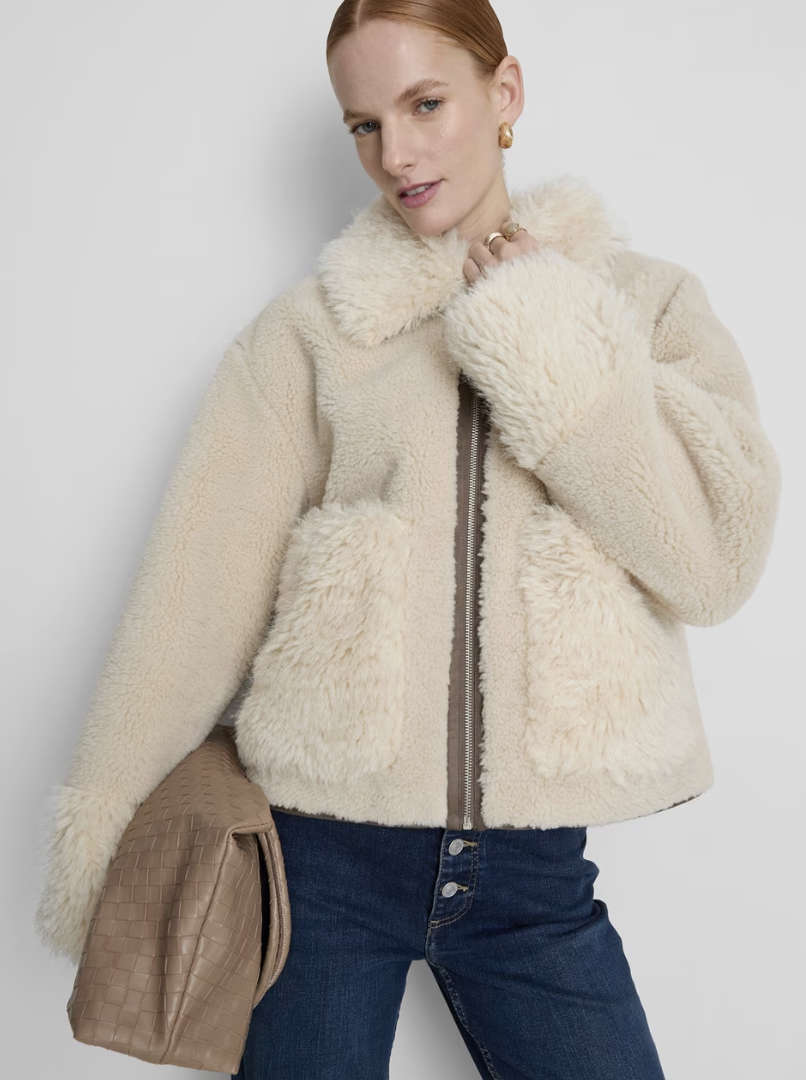 Made in a soft cream faux shearling fabric, it’s designed in a cropped shape with a straight hem for a modern twist on a classic look.