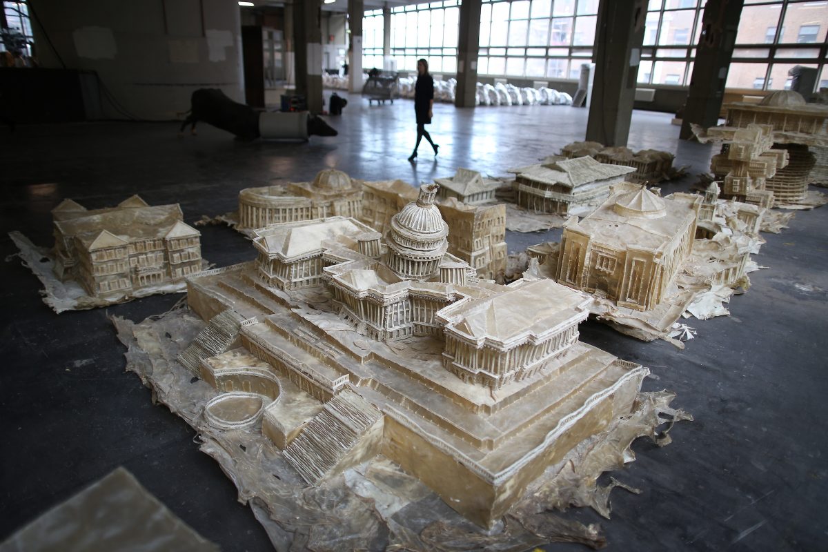 “Love it! Bite it!” (2005–2007), Liu Wei’s sculpture of world-famous buildings made from edible dog chews (photo by Peter Macdiarmid/Getty Images)