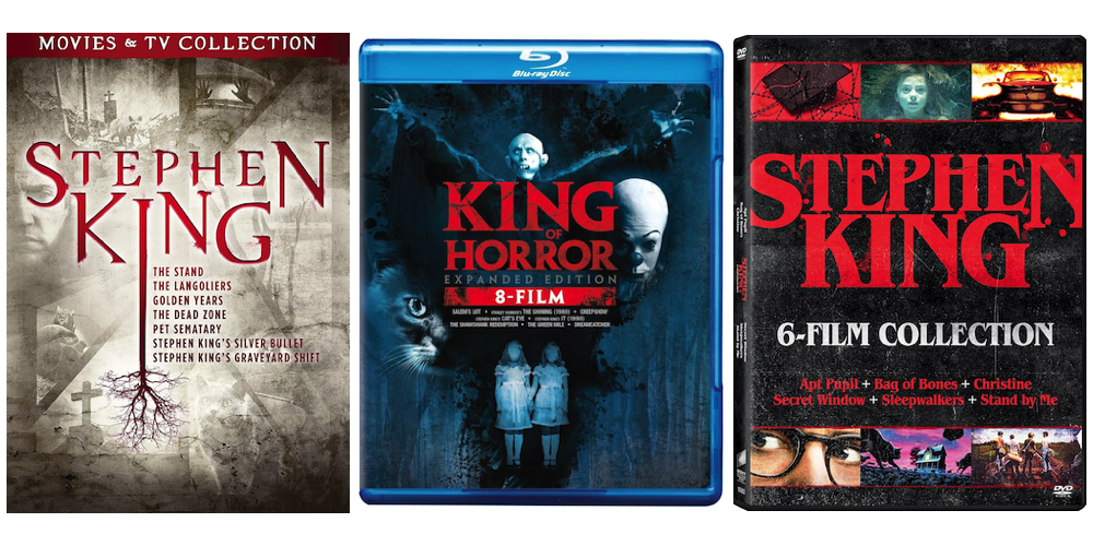 There are a lot of Stephen King DVD collections, but our favorites are the Stephen King Movies & TV Collection for $11.62 and the Stephen King 6-Film Collection for $12.29. The former includes The Stand, The Langoliers, Golden Years, The Dead Zone, Pet Sematary, Silver Bullet, and Graveyard Shift. The 6-Film Collection has an entirely different lineup: Art Pupil, Bag of Bones, Christine, Secret Window, Sleepwalkers, and Stand by Me.