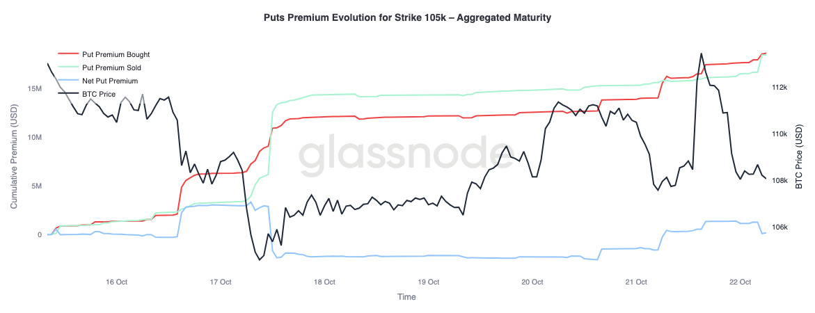 Moreover, at the $105K put, the pattern flips, reinforcing the same conclusion. As spot price climbed, net premiums on this strike rose, showing traders were more eager to pay for downside protection than for upside exposure. In essence, the latest rally was met with hedging, not conviction — the market is willing to insure risk rather than embrace belief.