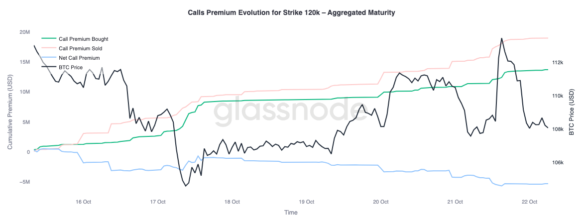 Glassnode’s aggregated premium data reinforces this view when analyzed by strike. At the $120K call, sold premiums have increased alongside price, showing traders are fading the rally and selling volatility into strength they view as temporary. Short-term yield seekers are capitalizing on spikes in implied volatility by selling calls into rallies rather than chasing upside.