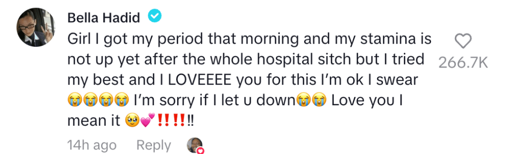 Rather than letting the chatter build, Bella decided to comment directly. “Girl, I got my period that morning and my stamina is not up yet after the whole hospital sitch,” she replied, referring to her recent Lyme disease flare-up that landed her in hospital.