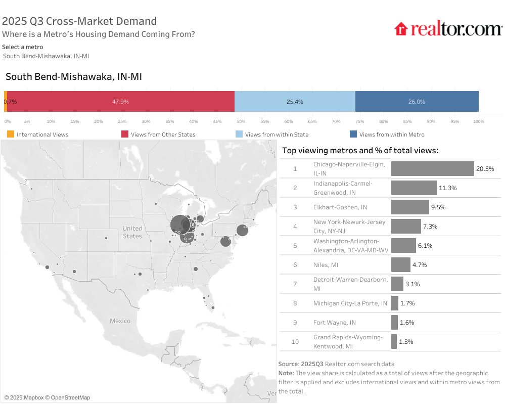 South Bend is midsized with roughly 325,000 residents, but pulled roughly three-quarters of its listing viewership from shoppers outside of the metro, due in large part to its proximity to Chicago. The median listing price in South Bend climbed 18.3% compared to one year before in September, and homes spent just 42 days on the market, roughly three weeks less than the national median.