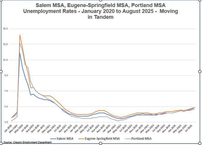 From August 2024 to August 2025, Salem gained several thousand jobs, the Portland area lost 2%of its jobs, and Eugene-Springfield area lost a handful of jobs.