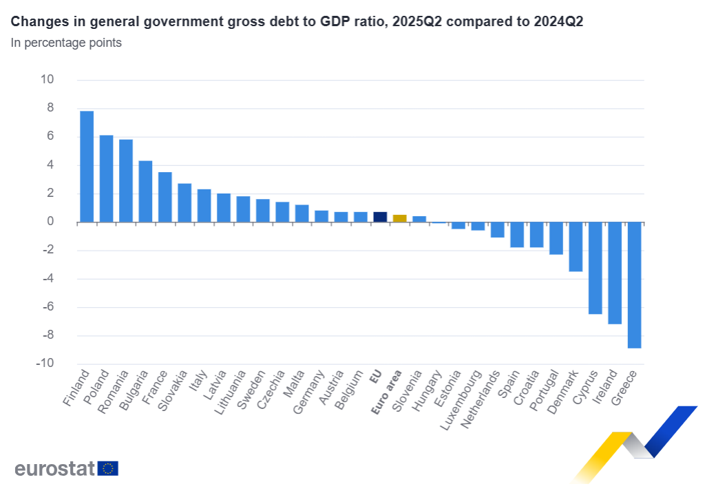 The EU statistical agency reported that the average public debt-to-GDP ratio across the EU stood at 81.9% at the end of the second quarter, while the eurozone average was higher at 88.2%.