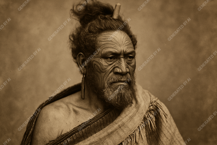 When asked to portray “a Māori in the 1860s”, Sora defaults to a sepia-toned studio portrait: a dignified man in a cloak, posed against a neutral backdrop.