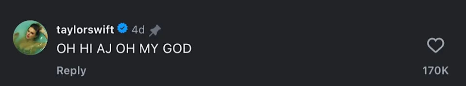 Taylor’s comment? “OH HI AJ OH MY GOD.” That one’s currently sitting near 200K likes.