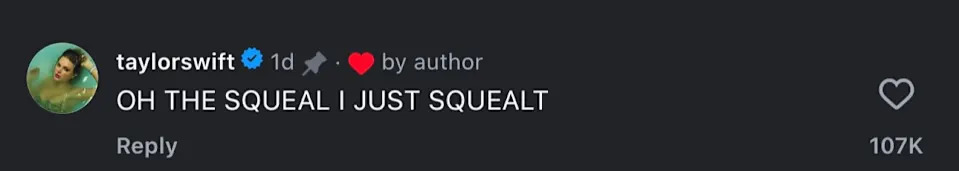 Swift couldn’t resist and her response was pure fangirl energy, writing, “OH THE SQUEAL I JUST SQUEALED.” The comment has since racked up over 100K likes.