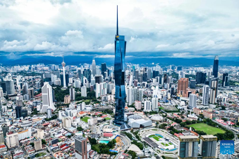 An aerial drone photo taken on Oct. 24, 2025 shows Merdeka 118, the venue for the China-U.S. economic and trade talks, in Kuala Lumpur, Malaysia. The Chinese and U.S. delegations convened on Saturday morning for talks on economic and trade issues. (Xinhua/Cheng Yiheng)