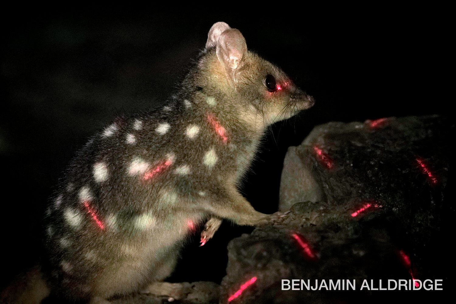 An eastern quoll glowing underneath Alldridge’s UV flash.