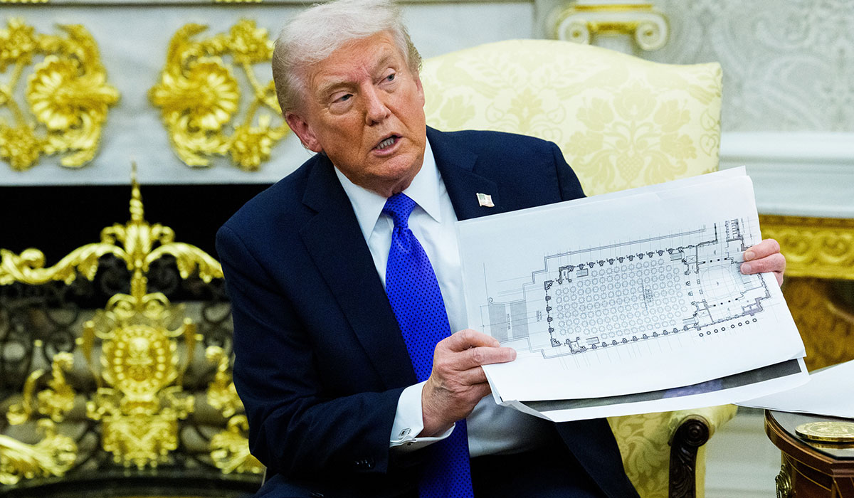 US President Donald Trump holds a floor plan of the planned White House Ballroom extension. Photographer: Aaron Schwartz/CNP/Bloomberg via Getty Images