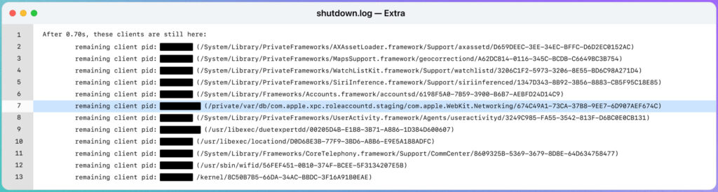 For years, the shutdown.log has served as a reliable detection point for iOS malware, including some of the most sophisticated spyware in circulation. Security researchers first noted in 2021 that Pegasus, the state-grade spyware developed by NSO Group, left behind identifiable traces in this log. By 2022, Pegasus had adapted by attempting to wipe shutdown.log, but residual anomalies still provided clues to its presence. These included sudden log truncations, missing entries, and specific file paths tied to Pegasus components. One such marker was the presence of the /private/var/db/com.apple.xpc.roleaccountd.staging/com.apple.WebKit.Networking path, indicative of Pegasus 2022 variants that had started mimicking legitimate system processes to evade detection.