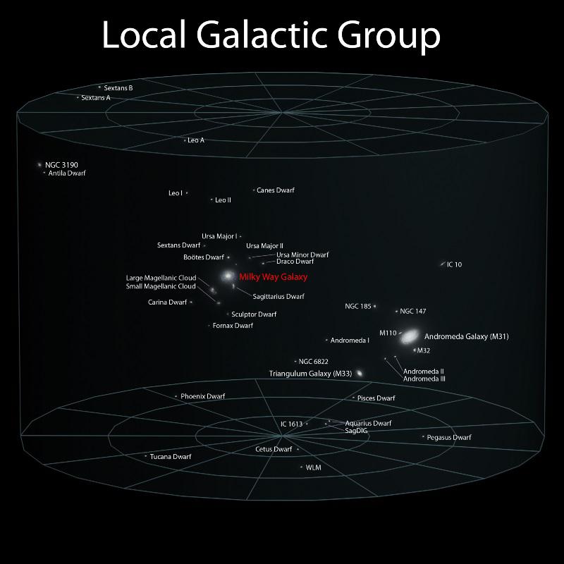 Our Local Group of galaxies is dominated by Andromeda and the Milky Way, but there’s no denying that Andromeda is the biggest, the Milky Way is #2, Triangulum is #3, and the LMC is #4. There are over 100 galaxies within the Local Group, but Andromeda and the Milky Way contain most of the stars, as well as most of the mass. All of the galaxies within the Local Group are gravitationally bound together, and the distances between them does not increase as the Universe expands.