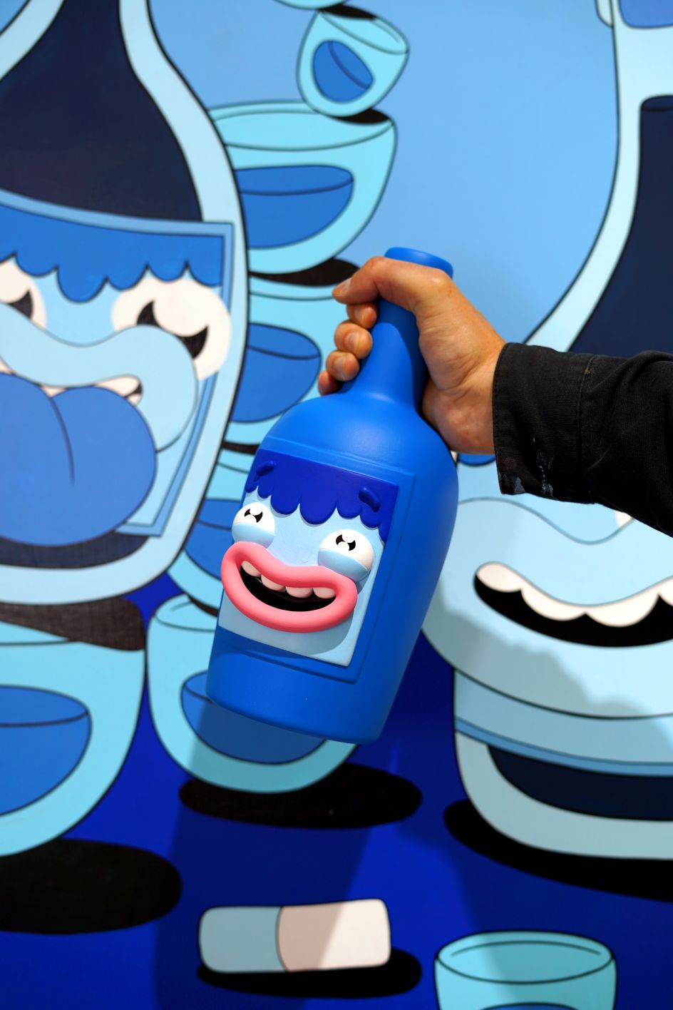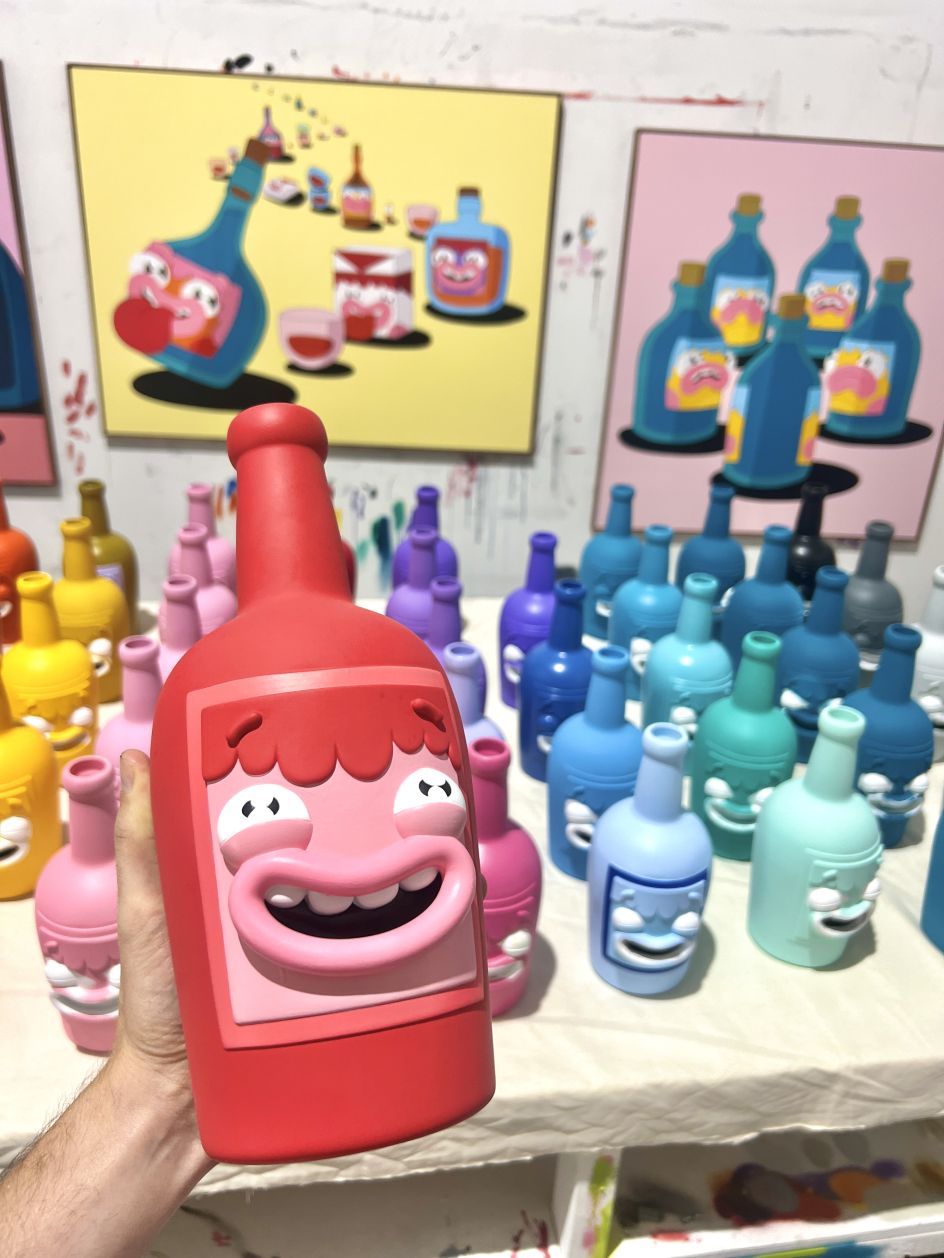 His most recent exhibition – CHEERS, held in London this September – is a case in point. The works, both painted and sculpted, explore the theme of social drinking. Bottle characters feature heavily across the collection, and while some are as exuberant as a Friday night drinker, others express the flip side of the indulgence.