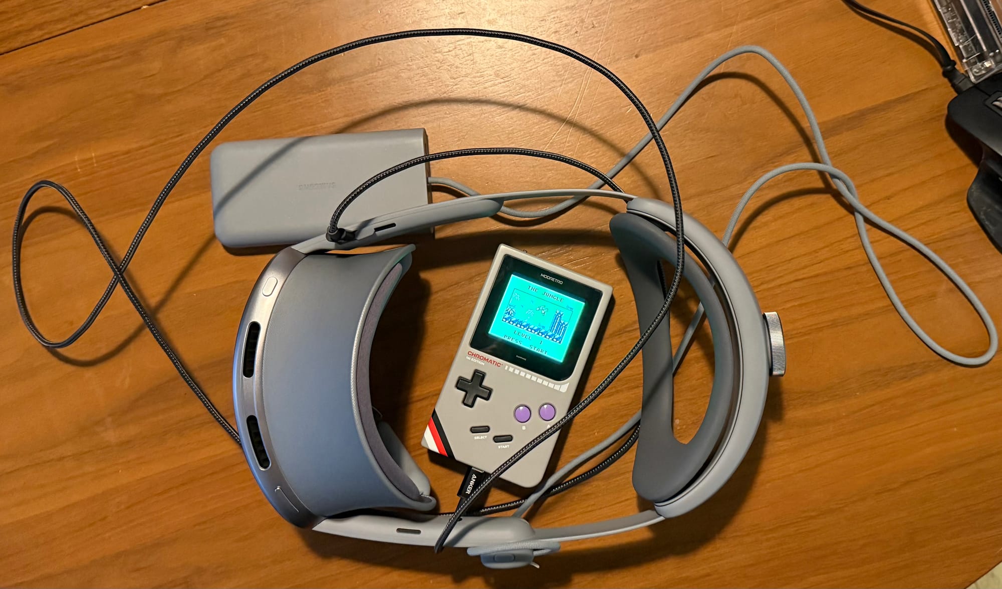 A Modretro Chromatic taking its power from the Galaxy XR headset from Samsung.