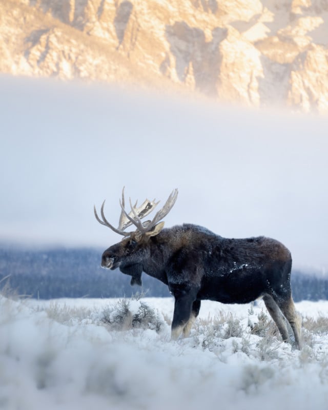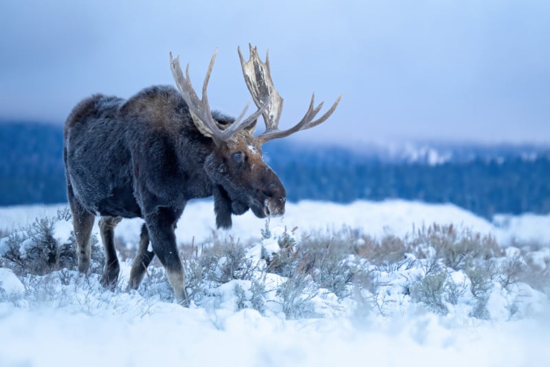 You’re photographing a bull moose 75 yards away in an open meadow. He’s grazing peacefully. After five minutes, he walks toward you, still grazing.