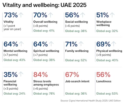 The number of UAE residents reporting strong mental health rose seven points year-on-year, to 64 per cent of those asked, 21 points above the global average.