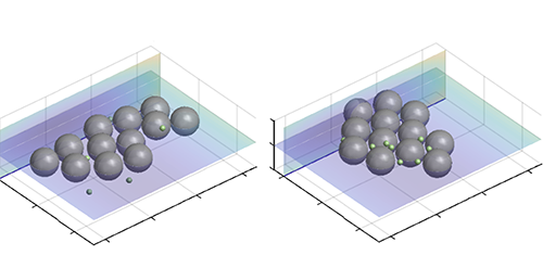 The two theorists modeled the behavior of spherical particles in a shallow liquid cell placed in an acoustic pressure field and driven by a background flow. Their simulation started with a set of 12 “seed” particles (5 µm diameter) and 13 “target” particles (500 nm diameter) and tracked the forces acting on each particle owing to background effects and interactions with its neighbors. Different flow rates, acoustic field strengths, and particle mass and size combinations were explored.