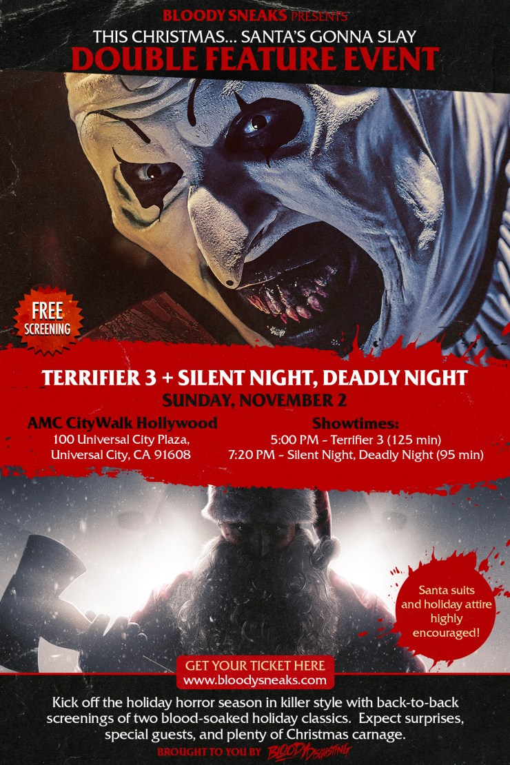 Terrifier 3 begins at 5pm PT on Sunday, November 2, followed by a very early sneak preview screening of the brand new Silent Night, Deadly Night movie at 7:20pm PT the same night!