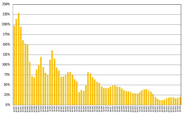 One thing: When an AWS revenue line in the chart above is flat, that means it is growing modestly because AWS is continually trying to lower the cost of a unit of compute, storage, or networking capacity to make it easier to consume more. And if a line is going up, capacity is rising faster than that line for the same reason over the course of years.